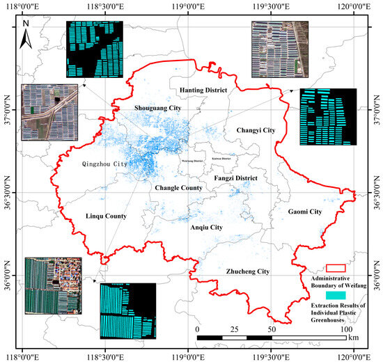 Extraction results map of individual plastic greenhouses in Weifang City.