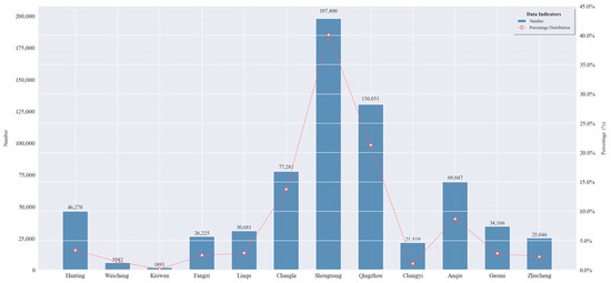 As part of the statistical analysis, Table 3 presents the number, area, and corresponding proportions of individual plastic greenhouses across all administrative divisions (districts, counties, and county-level cities) within Weifang City. Figure 12 is the bar chart of individual plastic greenhouse quantity statistics in Weifang City. The results indicate that Shouguang City is the most intensive greenhouse cultivation area, with 197,800 greenhouses, accounting for 29.72% of the municipal total. The corresponding coverage area reached 260.70 km2, representing 40.09% of the total area—ranking first in both quantity and spatial extent. Qingzhou City and Changle County followed, with 130,051 and 77,281 greenhouses, covering 138.24 km2 and 89.10 km2, respectively. Together, these regions form the core support base of Weifang’s greenhouse industry. In contrast, Kuiwen District, the central urban core, exhibited the lowest level of greenhouse development, with only 1891 units and a total area of 0.83 km2, accounting for just 0.28% of the city’s greenhouse count and 0.13% of the total area. This reflects the spatial constraints of facility-based agriculture in densely urbanized zones. Overall, the spatial distribution of individual plastic greenhouses in Weifang demonstrates a distinct pattern: higher density in the north, sparser distribution in the south, and low concentration in central urban areas with peripheral clustering. This evident spatial heterogeneity at the regional scale provides crucial data support for optimizing agricultural resource allocation, refining industrial spatial layout, and promoting the implementation of precision agricultural management strategies.