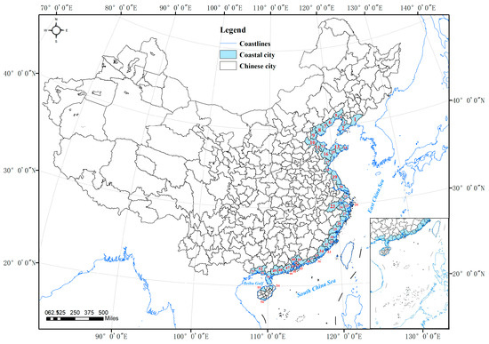As shown in Figure 1 and Table 1, China has 56 prefecture-level coastal cities directly adjacent to the sea (excluding Taiwan Province). Due to data availability constraints, this study did not include coastal cities in Taiwan Province. Furthermore, Sansha City in Hainan Province was excluded from the study due to its minimal built-up area.