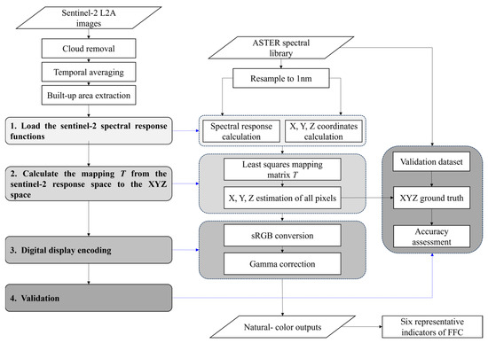 In previous studies, Sovdat et al. [21] proposed a method that approximates the fitting between satellite spectral bands and XYZ tristimulus values through a linear combination first, and then corrects the color by adjusting the hue angle in the xy plane projected from the CIE XYZ color space. This method has been proven to be highly accurate and operable, so the current study primarily referenced it for the pixel-by-pixel natural color correction of the acquired Sentinel-2 remote sensing images. The technical process is summarized in Figure 2.