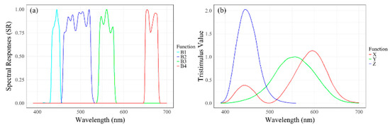 Here, , and are the CIE 1964 color-matching functions under a 10-degree observer (Figure 3b), with data from CIE 1964 color-matching functions, 10 degree observer|CIE. For any given set of ground object spectral reflectance sequences, their respective Sentinel-2 responses and XYZ component coordinates can be calculated as above, and then the linear mapping from the spectral space to the XYZ space can be fitted by solving the following least squares problem: