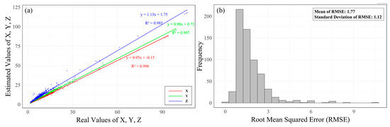 (a) Scatter plot of true vs. estimated XYZ values with fitted lines and (b) RMSE of estimated XYZ values.