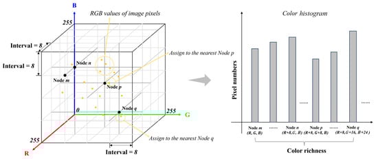 The color richness index was designed to describe the FFC diversity by constructing a color histogram. This involves dividing the RGB values of all pixels in a city into several color spaces and then counting the frequency of colors in each interval. If the colors are distributed across more intervals, the color richness is considered higher. The calculation steps are as follows (Figure 6):