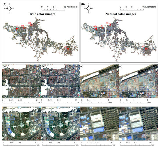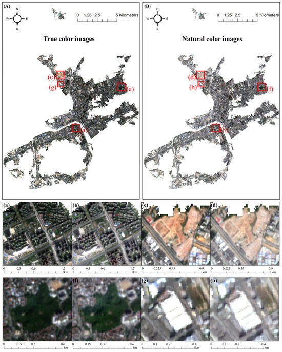 Figure 7 takes a southern Chinese coastal city (Zhuhai) as an example to compare the true-color image (Figure 7A) and the optimized natural-color product (Figure 7B) from Sentinel-2 satellite, with zoom-in comparative analysis conducted on randomly selected representative landscape features (Figure 7a–h). It can be seen that the true-color image has some noticeable color distortions. First, it presents a deep and dark visual effect, which may obscure details. In Figure 7a,e, building clusters blend almost seamlessly with dark green vegetation. Second, the true-color image has high saturation. In Figure 7c, bare land appears almost orange-red, which deviates significantly from the actual color of undeveloped land as perceived by the human eye. Similar color deviations are often observed in true-color remote sensing images of desert areas. Third, white objects in the true-color image, due to their high reflectivity, lose spectral and texture information. In Figure 7g, the lines on the white roofs of buildings are severely blurred. In this study, these distortion issues are effectively resolved in the optimized natural-color product, as shown in the details in Figure 7b,d,f,h.