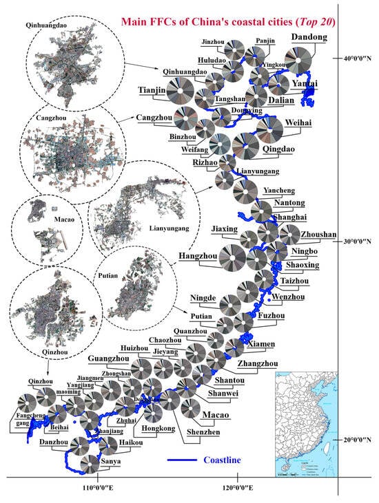 Pie charts of the top 20 dominant FFCs in 56 of China’s coastal cities, extracted from natural-color images using clustering algorithms. The area of each color corresponds to its proportion in the city. The RGB values of each color can be found in Table S1.