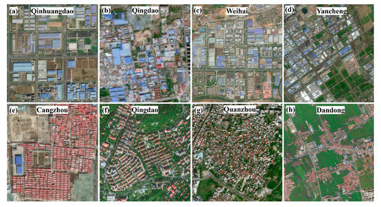 Despite the significant artificial transformation of urban surfaces, differences in natural conditions, economic structures, and cultural environments have laid the foundation for the uniqueness of urban FFCs. For instance, many industrially developed cities (e.g., Qinhuangdao, Tianjin, Dalian, Weihai, Qingdao, Yancheng, Nantong, Guangzhou, and Fangchenggang) exhibit blue tones in their FFCs, typically due to PVC anti-corrosion roofing on factories (Figure 10a–d). This material is resistant to chemical corrosion and is widely used in coastal cities with severe salt spray erosion. Additionally, blue helps reflect solar heat, reducing indoor temperatures in high-temperature environments, thereby saving energy and preventing fires. Moreover, some cities (e.g., Cangzhou, Dandong, Qingdao, and Quanzhou) feature red tones in their FFCs, mainly from traditional red-brick roofs in local villages, symbolizing regional cultural identity (Figure 10e–h).