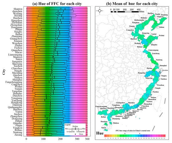 Hue reflects the fundamental attribute of color and is the most memorable color feature. As shown in Figure 12a and Table S2, FFCs in most cities have hue values ranging from 30° to 290°, manifesting that the dominant colors of these cities fall within the orange-yellow to blue-purple spectrum. Among them, Jieyang city in the south has the widest hue range (69.67–292.69°), covering various hues from yellow-green to purple-red, while Weifang city in the north has the narrowest hue range (172.97–312.85°), dominated by blue and purple hues.