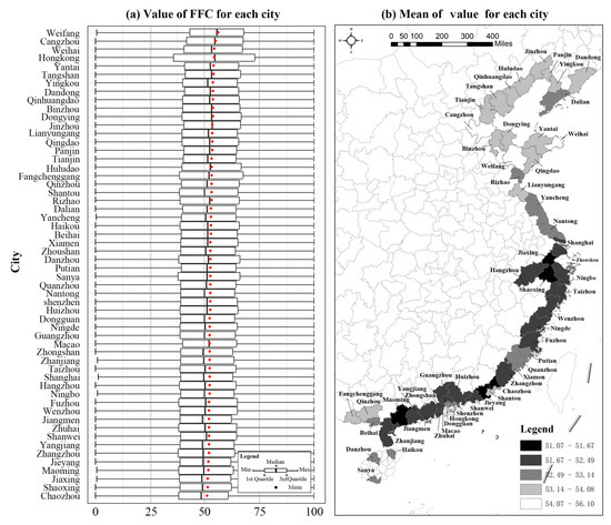- Wide spatial distribution. China’s coastal cities are distributed in a belt-like pattern (Figure 1), spanning from 18.36°N (Sanya) to 41.45°N (Jinzhou) and from 108.01°E (Fangchenggang) to 124.40°E (Dandong). They comprehensively cover tropical, subtropical, and temperate zones, making them ideal for analyzing spatial variations in FFC.