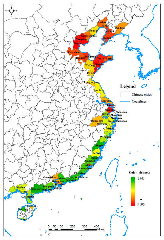 - Di, Q.; Ji, L. Analysis and Evaluation of Coastal Cities Marine Characteristics from the Perspective of Regional Identity. Sci. Geogr. Sin. 2016, 36, 1688–1696. [Google Scholar] [CrossRef]