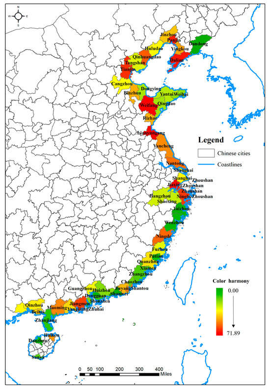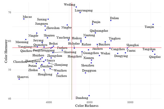 Based on the model proposed by Ou and Luo [37], color harmony can be measured by comprehensively evaluating hue harmony, saturation balance, and value balance. Therefore, this study attempted to calculate the harmony of the dominant colors in urban FFC by the following formula: