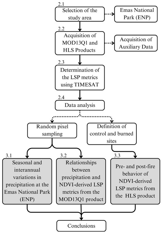 In this study, we assessed for the first time the effects of both precipitation and fire on NDVI-derived phenological metrics at the ENP, a protected savanna area in central Brazil. These metrics were calculated using the TIMESAT software, along with the MODIS MOD13Q1 and HLS products, across grassland and woodland areas. More specifically, the study aims to: (i) identify the driest and wettest seasonal cycles at the ENP during the MODIS data analysis period (2002–2023), using a 40-year rainfall time series from a meteorological station to determine rainfall patterns; (ii) examine the relationships between precipitation and each of the 13 TIMESAT phenological metrics derived from the 250-m MODIS MOD13Q1 product in both grassland and woodland areas of the park; and (iii) investigate the influence of fire and vegetation recovery in burned areas on the determination of LSP metrics in pre- and post-disturbance seasonal cycles, using the 30-m spatial resolution HLS product, which combines data from the Landsat and Sentinel-2 satellites.