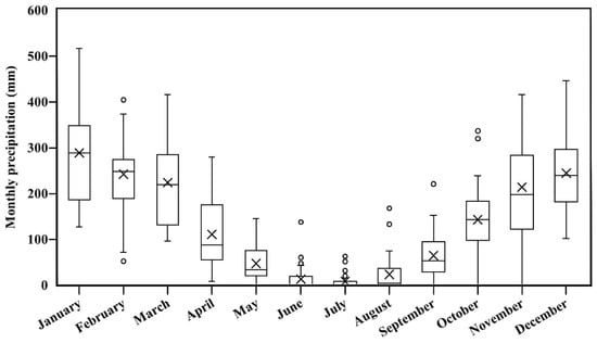 Variations in average long-term monthly precipitation (1983–2023) at Emas National Park (ENP). The mean values are represented by crosses, while the median values are shown as horizontal lines within the boxes for each month. Outliers are depicted as circles.