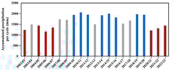 Interannual variations in accumulated precipitation on each cycle during the period of MODIS data analysis (2002/2003 to 2022/2023 cycles), compared to the long-term 1983–2023 period, are shown in the boxplot of Figure A2 (Appendix A). The results from the boxplot analysis of long-term rainfall data (1983–2023) from the meteorological station identified the following intervals of accumulated precipitation per cycle: severe dry cycle (<1153 mm), dry (1153–1433 mm), regular (1433–1814 mm), wet (1814–2057 mm), and severe wet cycle (>2057 mm). However, as shown in Figure 5, no severe dry or wet cycles were detected during the period of MODIS data analysis. The seven dry cycles that deviated from the Climatological Normal were 2002/2003, 2004/2005, 2005/2006, 2006/2007, 2020/2021, 2021/2022, and 2022/2023, as indicated by the red color in Figure 5. The eight wet cycles detected in our analysis were 2009/2010, 2010/2011, 2011/2012, 2013/2014, 2014/2015, 2015/2016, 2018/2019, and 2019/2020 (blue color in Figure 5). The remaining six cycles were classified as regular cycles in the boxplot analysis when compared to the 1983–2023 long-term rainfall (gray color in Figure 5).