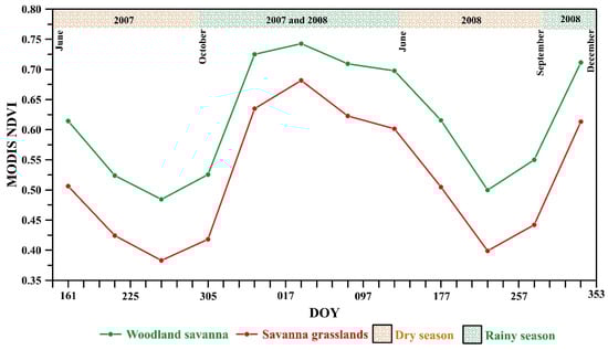 Average MODIS NDVI variations in areas of woodlands and grasslands at the EMAS National Park (ENP) during the 2007/2008 seasonal cycle (October 2007 to September 2008). The local dry and rainy seasons are indicated at the top of figure.