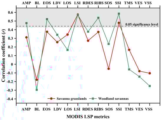 (ii) For the MODIS LSP metrics most sensitive to precipitation, the highest correlation coefficients were observed in woodland areas. This may reflect the higher occurrence of fire disturbance typically observed in grassland areas, which introduces variability into the data analysis.