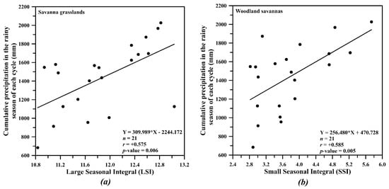 Relationships of the cumulative precipitation in the rainy season of each seasonal cycle (2002–2003 to 2022/2023) with the MODIS extracted metrics (a) Large Seasonal Integral (LSI) and (b) Small Seasonal Integral (SSI) in areas of grasslands and woodlands, respectively.