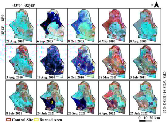False-color composites of the Emas National Park (ENP) using the NIR, SWIR-1, and SWIR-2 Landsat bands in RGB, respectively. Images from TM/Landsat-5 (top), ETM+/Landsat-7 (middle), and OLI/Landsat-8 (bottom) depict the landscape before and after fire events on 1 September 2005 (affecting 45% of the park’s area), 12 August 2010 (90%), and 10 July 2021 (21%), respectively. At the bottom, the locations of the selected control (non-burned) and burned sites are shown on the image from 24 July 2021. Burned areas are shown in dark blue, while vegetation recovery in these areas is depicted in red.
