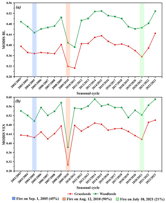 Interannual variations in the MODIS Land Surface Phenology (LSP) metrics (a) Base Level (BL) and (b) Value for the End of the Season (VES) in savanna grassland (red line) and woodland (green lines) areas from the EMAS National Park (ENP). Three major fire events during this period are highlighted by colored shaded columns: 1 September 2005 (affecting 45% of the park’s area), 12 August 2010 (90%), and 10 July 2021 (21%).
