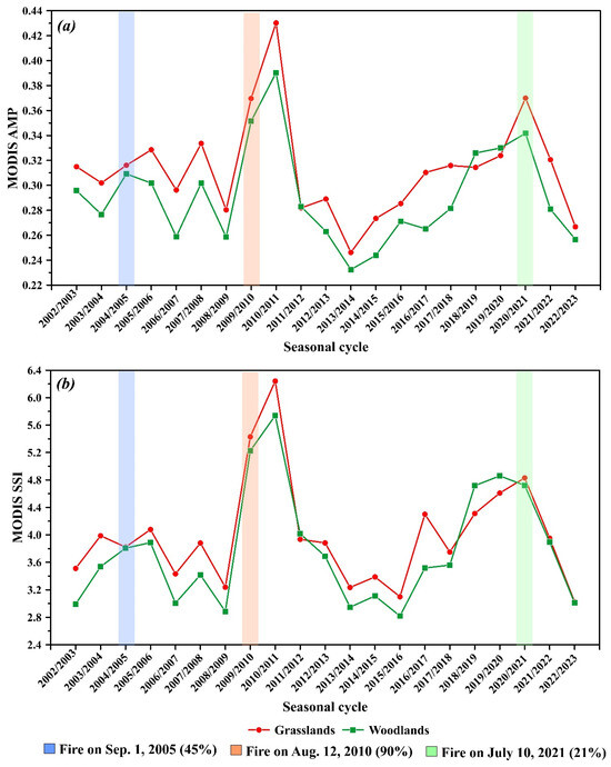 Interannual variations in the MODIS Land Surface Phenology (LSP) metrics (a) Amplitude (AMP) and (b) Small Seasonal Integral (SSI) in savanna grassland (red line) and woodland (green lines) areas from the EMAS National Park (ENP). Three major fire events during this period are highlighted by colored shaded columns: 1 September 2005 (affecting 45% of the park’s area), 12 August 2010 (90%), and 10 July 2021 (21%).