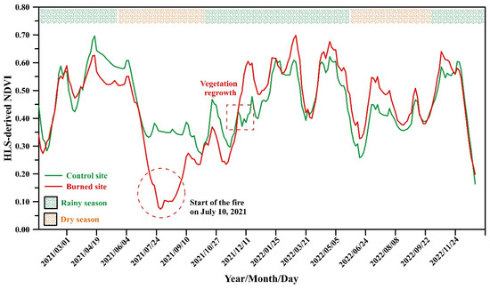 Seasonal variations in HLS-derived NDVI, highlighting the effects of 2021 fire event and resultant burned area on NDVI response of savanna grasslands. In comparison with the control site, this event is marked by a decrease in the NDVI (dashed circle in red) during the dry season (symbols in orange at the top of figure) of the 2020/2021 cycle, and by a notable post-burning vegetation recovery at the start of the subsequent rainy season (symbols in green at the top of figure) from the following 2021/2022 cycle. The dashed square indicates the intersection point of the NDVI response for burned and non-burned grassland sites.
