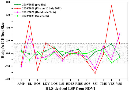 Effect size of fire occurrence starting on 10 July 2021, on HLS-derived Land Surface Phenology (LSP) metrics, calculated from NDVI, for seasonal cycles ranging from 2019/2020 (pre-fire) to 2022/2023. The Hedge’s G metric was used to compare adjacent burned and non-burned (control) grassland areas. The burned area influenced the determination of LSP metrics beyond the shaded area, affecting both the seasonal cycle during which the event occurred (2020/2021) and the following cycle (2021/2022). Abbreviations are defined in the text.