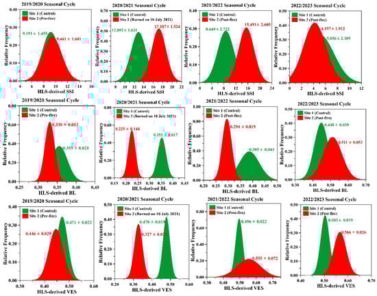 Pairs of Gaussian-fitted histograms for the control (Site 1) and burned (Site 2) grassland sites, illustrating relative variations in the HLS-derived phenological metrics: Small Seasonal Integral (SSI; top), Base Level (BL; middle), and Value for the End of the Season (VES; bottom). Results are presented for the seasonal cycle preceding the fire event (2019/2021), the cycle during which the fire occurred (2020/2021), and two post-fire cycles characterized by vegetation recovery (2021/2022 and 2022/2023).