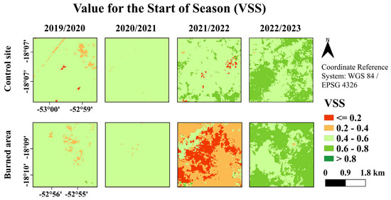 Spatial variation in the Value for the Start of Season (VSS) across control and burned sites, highlighting the effects on the subsequent seasonal cycle following the fire event on 10 July 2021. Results are presented for the seasonal cycle preceding the fire event (2019/2021), the cycle during which the fire occurred (2020/2021), and two post-fire cycles characterized by vegetation recovery (2021/2022 and 2022/2023).