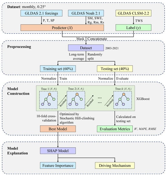 Extreme Gradient Boosting (XGBoost) has emerged as a powerful ensemble machine learning approach in hydrological studies for its superior performance in handling complex, non-linear relationships in Earth system data []. XGBoost is an ensemble learning method that sequentially trains weak learners (typically decision trees) to correct the errors of previous models, thereby improving overall prediction accuracy. It also incorporates regularization techniques to prevent overfitting [,,,]. Additionally, its computational efficiency is enhanced by parallel processing, out-of-core computation, GPU acceleration, and distributed training, making it particularly suitable for large-scale hydrological datasets. Moreover, regional-scale studies on TWS reconstruction have demonstrated that XGBoost achieves comparable or superior predictive performance compared to artificial neural networks and random forests while maintaining model interpretability [,]. Based on these advantages, XGBoost was selected for TWS simulation in this study.