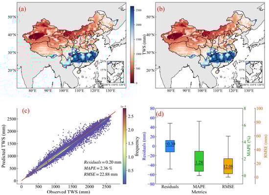Model evaluation results on the testing set: spatial distribution of TWS observations (a) and XGBoost predictions (b), which are almost identical; scatter plot of comparison between observed TWS and predicted TWS (c); box plot for evaluation metrics of residuals, MAPE, RMSE (d).