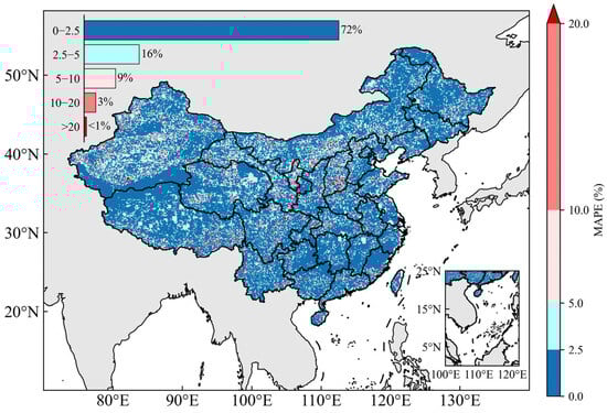 A more in-depth analysis of the spatial distribution of the MAPE was conducted to better understand model performance across different regions. Figure 4 illustrates the spatial distribution of the MAPE. The results demonstrate exceptional model accuracy, with approximately 70% of monitoring points achieving MAPE values below 2.5%, while over 99% of points fall within the 20% threshold. Furthermore, larger MAPE values are predominantly concentrated in the Yellow River Basin and arid northwestern regions, characterized by intensive anthropogenic activities such as irrigation withdrawals and reservoir operations. This spatial correspondence suggests that human-induced hydrological modifications may introduce additional uncertainty, leading to increased prediction errors in these sensitive zones. Overall, model predictions demonstrate strong agreement with observed TWS, as supported by the evaluation metrics, thus providing a robust foundation for subsequent SHAP analysis.