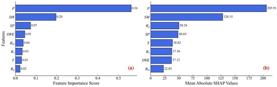 Figure 5 illustrates the feature importance derived from the XGBoost model using GBI and SHAP methods. Both approaches consistently identify P and SM as the most important features, with SP also showing a relatively high influence. This strong agreement between the two methods enhances the credibility of the results. However, a divergence is observed in the evaluation of T, Rg, and Rs: the GBI method attributes relatively low importance to these variables, whereas the SHAP method suggests a greater contribution. This discrepancy may be attributed to the GBI method’s limited capacity to accurately account for multicollinearity among input features, which can obscure the true importance of correlated variables. These findings further underscore the necessity of employing the SHAP method for more robust and reliable interpretation of feature contributions.