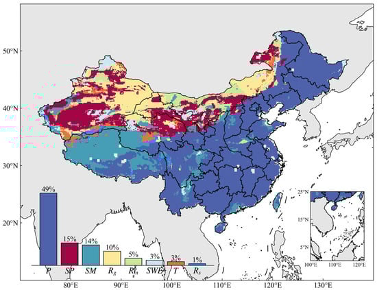 Spatial distribution of dominant driving factors for TWS across China, based on SHAP analysis. The heights of the bars (bottom left) indicate the percentage of the grid cells dominated by the corresponding drivers.