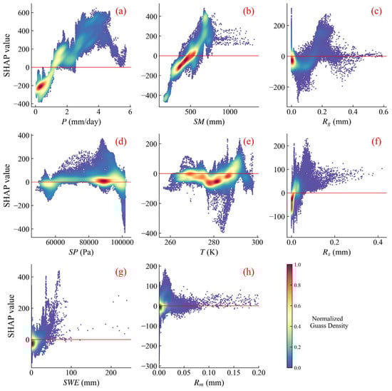 SHAP dependence plots depicting the SHAP main values along the gradient of (a) P, (b) SM, (c) Rg, (d) SP, (e) T, (f) Rs, (g) SWE, (h) Rm. The lateral axis indicates the gradient of variable values. The vertical axis indicates the magnitude of the SHAP main values. Positive SHAP values indicate a positive influence on TWS output while negative SHAP values indicate a negative influence.
