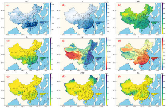 Spatial distribution maps for multi-year averages of TWS and hydroclimatic factors: TWS (a), P (b), SM (c), Rg (d), SP (e), T (f), Rs (g), SWE (h), and Rm (i).