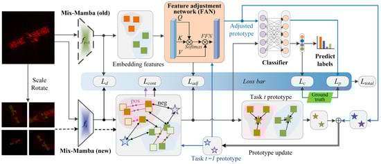 Take task t as an example for generally describing the training and test of MMFAN. First, the parameters of Mix-Mamba in task t − 1 are fixed and copied as the old backbone (which does not involve gradient calculation) to serve as a reference for the historical memory. The new backbone participates in all gradient backpropagation and parameter updating and obtains classification results. Then, the input image is fed into both the old and new backbones to obtain the embedding features and , respectively. In order to constrain the new model from overfitting to the distribution of new classes, the distillation loss is calculated to minimize the difference between the features extracted by the old and new models, both from a new sample. For the new model, the augmented input samples (by scaling and rotating on ) are fed into the new backbone to obtain augmented features . Then and the historical prototypes serve as a contrastive learning template for supervised contrastive learning with , obtaining a contrastive loss .