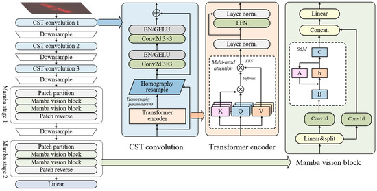 The network structure of Mix-Mamba is shown in Figure 2, which is composed of three CST convolution stages and two Mamba stages. Compared with the original Mamba, Mix-Mamba mainly increases the CST convolution as a deformation-robust structure; in addition, motivated by Vision Transformer, Mix-Mamba uses the Mamba vision block to extract global features as 2D feature maps. As a backbone, Mix-Mamba takes image samples as input and obtains embedding vectors with the dimension of . Due to the spatial inductive bias and strong local feature-extraction capabilities of convolutional networks, the CST convolution stages with residuals are designed to extract high-resolution features while adjusting deformations such as scaling, rotation, and perspective distortion in the feature maps. Mamba stages divide the feature maps into patches and employ selective scanning structured state-space models (S6M) [59] for global context modeling, thus overcoming the limitations of capturing global spatial relationships for convolutional networks.