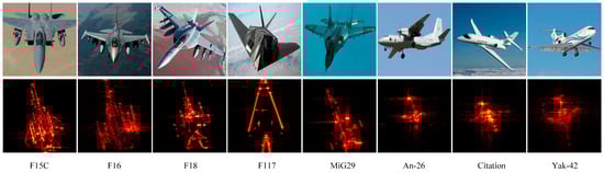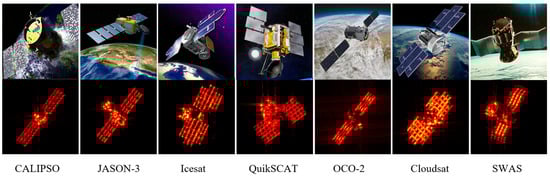 To validate the performance of the proposed MMFAN, an ISAR image dataset with seven classes of satellite targets [7] is constructed, which consists of CALIPSO, Jason-3, IceSat, QuikSCAT, OCO-2, Cloudsat, and SWAS. Firstly, a local coordinate system for each target is established. Based on the physical-optical theory, the HV-polarized echoes of the target 3D models are generated by electromagnetic computing at the 17 GHz radar carrier frequency and bandwidths of B = 1, 1.5, and 2 GHz, respectively, where the target elevation angles are set as 50° and 55° and azimuth angles are varying from 0° to 360° with a step of 0.02°. Then, ISAR imaging is performed by the back-projection algorithm [64], where azimuth accumulation angles are set to 4, 5, and 6°, and the azimuth interval between images is 1°. Therefore, 360 ISAR images are obtained for each class for a combination of . The ISAR images are finally centered around the target and cropped to the size of 120 × 120 pixels. Figure 3 shows the optical and ISAR image samples for the seven targets.