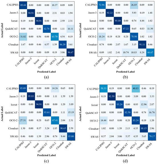Confusion matrices (%) of different test scenarios. (a) Normal scenario. (b) Scaled scenario. (c) Rotated scenario. (d) Combined scenario.