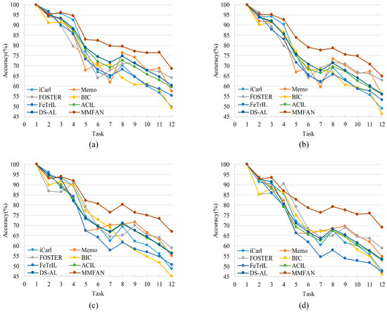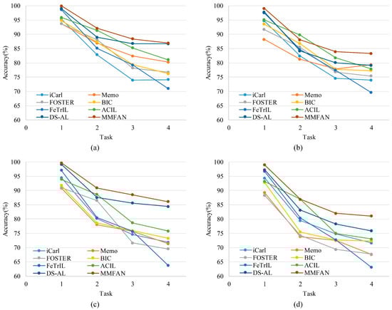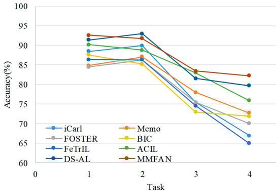 It can be seen that the proposed MMFAN achieves higher average accuracy in all test scenarios. Compared to exemplar-based models, although without original data, non-exemplar models can still avoid catastrophic forgetting through special network parameters or feature transfer techniques. Nevertheless, non-exemplar models also have significant advantages in terms of data storage and security. The accuracy evolution with incremental tasks of these models is shown in Figure 6. As new tasks are added, MMFAN has a lower decay in classification accuracy compared with other methods; therefore, the proposed method maintains better performance during incremental target samples.