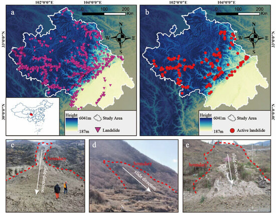 Geographical location and landslide distribution in northwest Sichuan. (a) Distribution of landslide samples; (b) distribution of active landslides; (c–e) field survey real-scene images of landslides.
