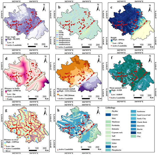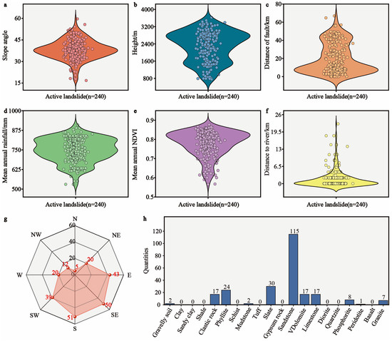 Spatial distribution of active landslides. (a) Slope angle; (b) elevation; (c) distance to faults; (d) average annual rainfall from 2003 to 2022; (e) average annual NDVI from 2003 to 2022; (f) distance to rivers; (g) slope aspect; (h) lithology. Among these, the x-axes of Figures (a–f) represent the 240 active landslides.