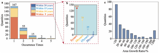 Statistical analysis of landslide occurrences and characteristics. (a) Frequency of landslide occurrences; (b) frequency of active landslides over 5-year intervals (5, 10, 15, and 20 years); (c) number of landslides categorized by area growth increments of 20%.