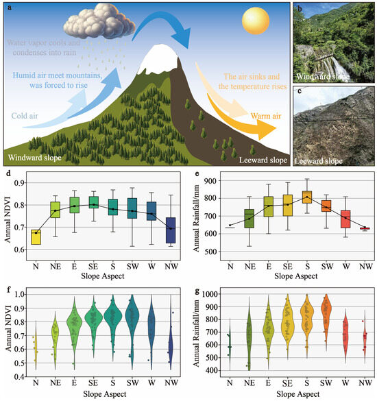 Effects of Föhn wind on windward and leeward slopes and related factors. (a) Diagram illustrating the causes and impact patterns of the Föhn wind effect. (b) Photograph of the windward slope in northwest Sichuan, showing dense vegetation and abundant hydrological conditions. (c) Photograph of the leeward slope in northwest Sichuan, showing sparser vegetation conditions. (d) 20-year average NDVI values at active landslide locations across different slope aspects. The boxes represent the interquartile range (IQR) between the first (Q1) and third (Q3) quartiles, with whiskers extending from (Q1 − 1.5IQR) to (Q3 + 1.5IQR). The horizontal line within each box represents the median, square symbols represent the mean, and connecting lines show the mean values. One-way analysis of variance (ANOVA) results indicate a p-value of <0.001 for the eight slope aspects. (e) 20-year average annual rainfall values at active landslide locations across different slope aspects. One-way analysis of variance (ANOVA) results indicate a p-value of <0.001 for the eight slope aspects. (f) NDVI values in the year preceding the first occurrence of active landslides across different slope aspects. (g) Annual rainfall values in the year preceding the first occurrence of active landslides across different slope aspects.