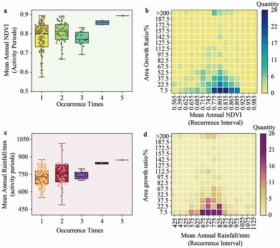 Relationship between landslide activity, NDVI, rainfall, and landslide area growth. (a) Mean annual NDVI values during the observation period for landslides with different activity frequencies; (b) heatmap showing the correlation between the mean annual NDVI values between each active landslide activity and the preceding activity, and the landslide area growth ratio; (c) mean annual average rainfall values during the observation period for landslides with different activity frequencies; (d) heatmap showing the correlation between the mean annual rainfall values between each active landslide activity and the preceding activity, and the landslide area growth ratio. The box in the boxplot represents the interquartile range (IQR) between the first (Q1) and third (Q3) quartiles, with whiskers extending from (Q1 − 1.5IQR) to (Q3 + 1.5IQR). The horizontal line inside each box represents the median.