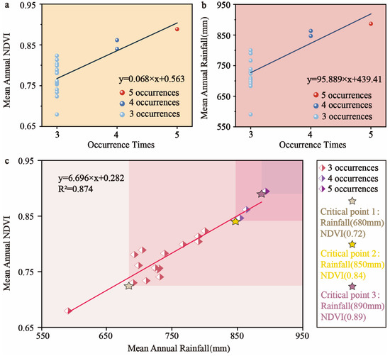 Relationships between landslide activity, NDVI, and rainfall in high-frequency landslides. (a) Relationship between high-frequency landslides and the mean NDVI during the observation period—the straight line represents the fitted equation between the two variables; (b) relationship between high-frequency landslides and the mean annual rainfall during the observation period—the straight line represents the fitted equation between the two variables; (c) rainfall and NDVI thresholds for landslides with high frequency.