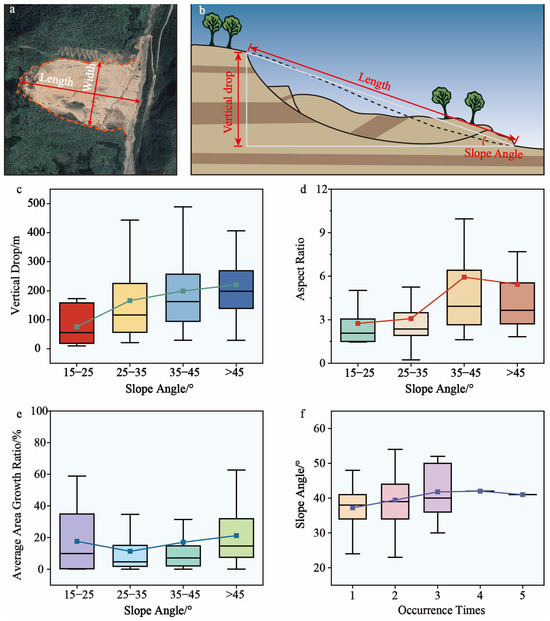 The effect of slope on landslide evolution. (a) Major and minor axes of the landslide in satellite imagery, with the orange dashed line representing the landslide boundary and the red lines representing the major and minor axes of the landslide; (b) method for determining the landslide vertical drop, the dashed lines in the figure represent the original shape of the slope.; (c) boxplot of grouped statistics for landslide slope and vertical drop; (d) boxplot of grouped statistics for landslide slope and aspect ratio; (e) boxplot of grouped statistics for landslide slope and annual average area growth rate; (f) boxplot of grouped statistics for landslide activity frequency and slope. The box represents the interquartile range (IQR) between the first (Q1) and third (Q3) quartiles, with whiskers extending from (Q1 − 1.5IQR) to (Q3 + 1.5IQR). The horizontal line inside the box represents the median, the square symbol represents the mean, and the connecting line shows the mean.