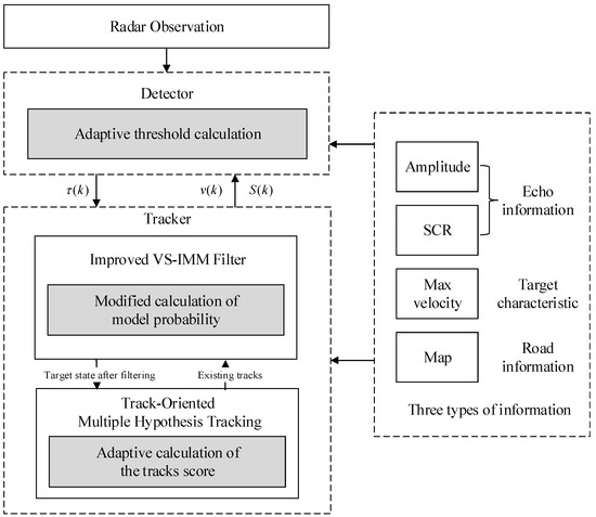 Additionally, researchers have turned their attention to information-aided techniques. These techniques leverage a priori information such as target classification, echo signal amplitude, SNR, and road constraints to assist in the design of both detectors and trackers while enhancing their performances. Numerous experiments have demonstrated that information-aided techniques significantly enhance the operational efficacy of integrated detection and tracking systems. Echo amplitude information has been incorporated to refine track association probabilities within the PDAF framework in [18,19]. Subsequently, the interacting multiple model (IMM) algorithm was combined with PDAF [20], yielding promising results for tracking weak targets in dense clutter characterized by a Rayleigh amplitude distribution. Similarly, the utilization of echo amplitude information in a heavy-tailed K-distribution clutter environment has been shown to improve tracking performance [21]. Target characteristics and attribute information represent another crucial category of auxiliary information, including target type, motion parameters (e.g., maximum speed and acceleration), and radar cross section (RCS) data. These two concepts were formally defined in [22]: characteristics refer to continuous-sample-space properties derived from sensor data beyond basic positional variables, while attributes are discrete-sample-space properties, such as target type or radar system type. These parameters were employed to optimize gate size and track association probability. Building upon this foundation, the utilization of target classification information for multi-frame data association has been explored [23], while the impact of Doppler information on tracking performance has been analyzed [24]. For ground moving target tracking, terrain and road constraints play a crucial role in determining target motion states. The integration of digital elevation data into target detection was undertaken by the U.S. Air Force Research Laboratory, leading to the proposal of a fast filtering detection algorithm that enhanced radar blind-spot detection capabilities [25]. Furthermore, the integration of map information, primarily road constraints, with the Variable Structure Interacting Multiple Model (VS-IMM) algorithm has been shown to reduce tracking errors for ground targets [26]. The refinement of road information for target tracking has also been explored [27,28], and  the integration of route information with the VS-IMM filter has been shown to improve the performance of maritime target tracking [29]. However, when integrating road network information using the VS-IMM filter, most existing methods design only filter models based on road information and use neighborhood ellipses for road matching. This approach does not deeply integrate road network information with the VS-IMM filter, and the use of neighborhood ellipses for road matching results in high computational complexity.