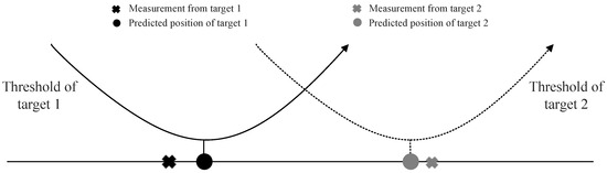 36. Bar-Shalom, Y.; Blackman, S.S.; Fitzgerald, R.J. Dimensionless score function for multiple hypothesis tracking. IEEE Trans. Aerosp. Electron. Syst. 2007, 43, 392–400. [Google Scholar] [CrossRef]