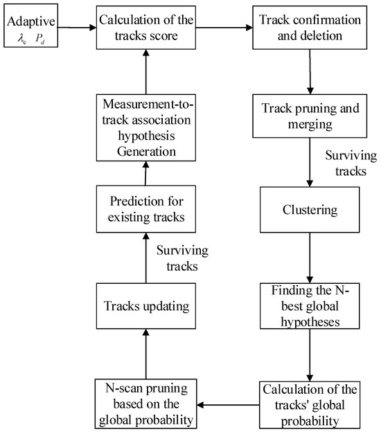 As Figure 4 shows, at each time step, TOMHT predicts the existing tracks and forms various possible measurement-to-track association hypotheses and new tracks using the measurements within the gating region. The scores of these hypothesized tracks are calculated using adaptive detection probabilities and dynamic clutter density. In the track management module, track confirmation, pruning, and merging operations are first performed based on track scores, followed by clustering of the surviving tracks. Then, within each cluster, global optimal hypothesis generation and global track probability calculation are carried out in parallel. The number of hypothesized tracks is limited by employing N-scan pruning techniques and track deletion methods based on global probabilities. Finally, the remaining tracks in the track management module are updated, and the optimal tracking result for the current time step is output. Upon receiving new measurement data, the target tracking process continues for the next time step.