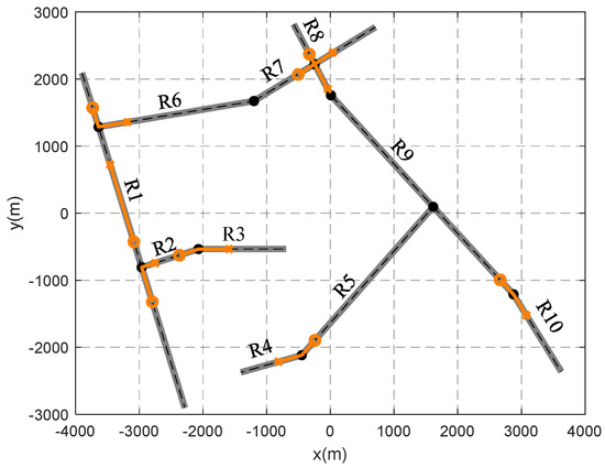 The simulation scenario is shown in Figure 5, where there are 10 roads (R1-R10), each associated with a filter that has different road process noise characteristics. The scenario includes nine intersections, with the connecting roads forming three types of angles: acute, right, and obtuse. The scenario features eight targets with different survival times and motion characteristics. The initial states of the eight targets are listed in Table 1. In the simulation experiment, the sampling period T = 1 s is used, and 12 filter models are implemented. Among these, two initialization models have process noise in the X and Y directions, σ x = σ y = 2 2 ( m / s 2 ) and σ x = σ y = 5 ( m / s 2 ) , corresponding to constant velocity and maneuver modes, respectively. The remaining 10 models are matched to the roads, with process noise in the direction along the road σ a = 1 ( m / s 2 ) and in the orthogonal direction σ o = 0.01 ( m / s 2 ) . Since the 10 roads have different angles with the X-axis, the process noise covariance varies.